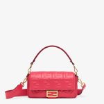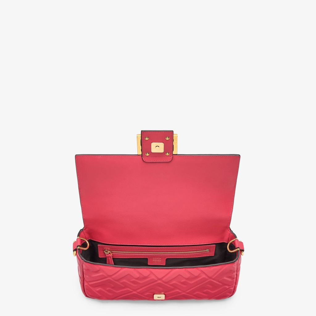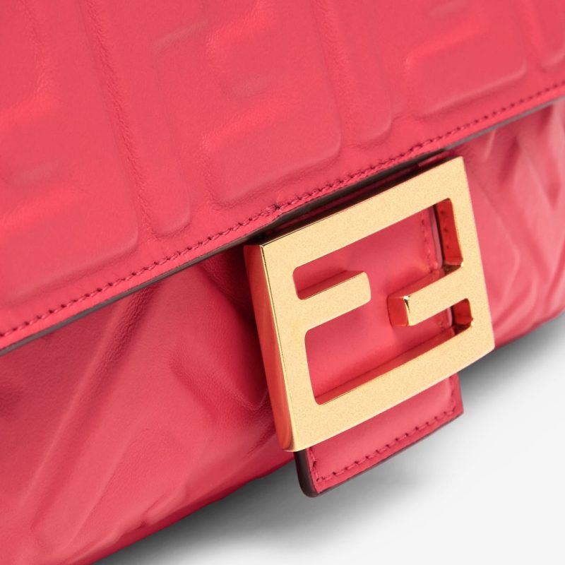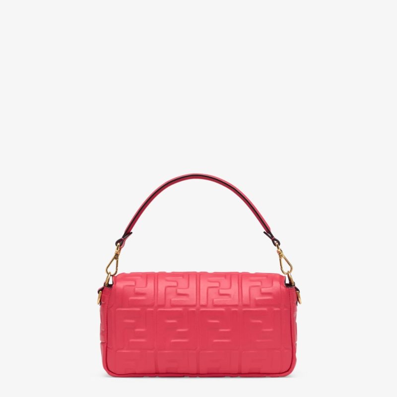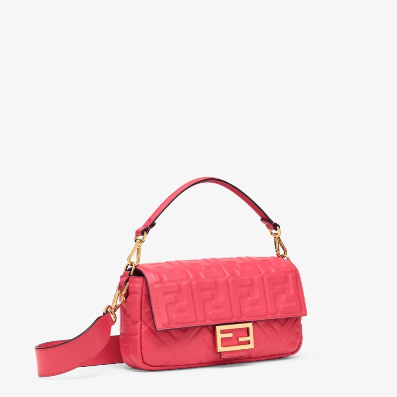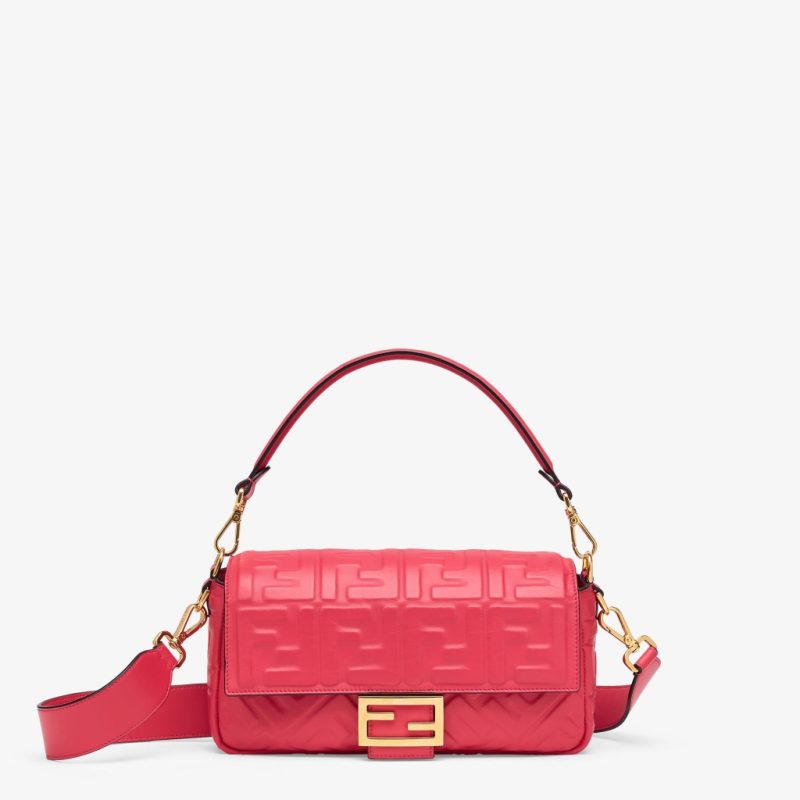 Iconic medium Baguette bag made of soft nappa leather in raspberry red with a 3D texture, embossed FF motif. Embellished with an FF clasp.