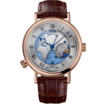 European and continental versions: this watch remembers the two independent time zone settings. Once the watch has been correctly set to the two desired time zones, pressing the push-piece at 8 o’clock instantly switches between them, which Breguet calls “INSTANT-JUMP”. Ingeniously, the watch not only remembers the different time zones, but also AM/PM and the date, and adjusts these complications correctly to the desired time zone. Essentially, the watch “remembers” the time zone and its associated settings, allowing the user to switch between the two desired time zones at the push of a button. Polished rose gold case, dial: silvered frame, black Roman numerals. Black dotted minute markers with 18k pink gold dots applied at 5-minute intervals. Texture. White gold depicting the continents of Europe and Africa, translucent blue sea with wave motif. hand-engraved plate on AM/PM aperture. Blued steel “Breguet-style” hands.